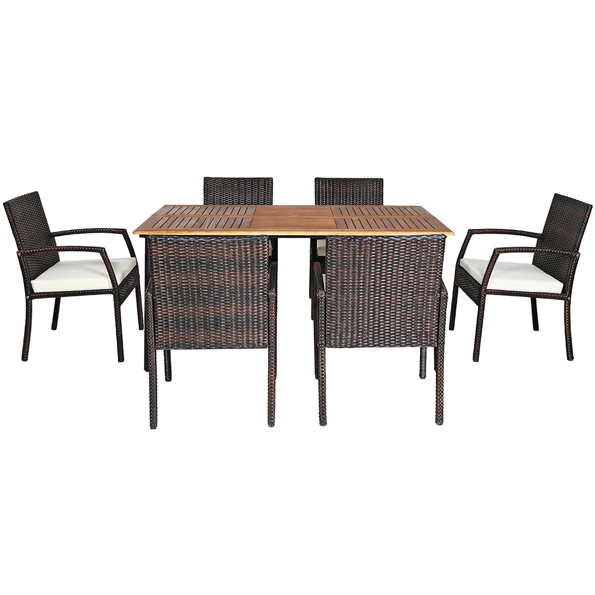 7 Piece Patio Rattan Dining Set with Wooden Table Top and Umbrella Hole