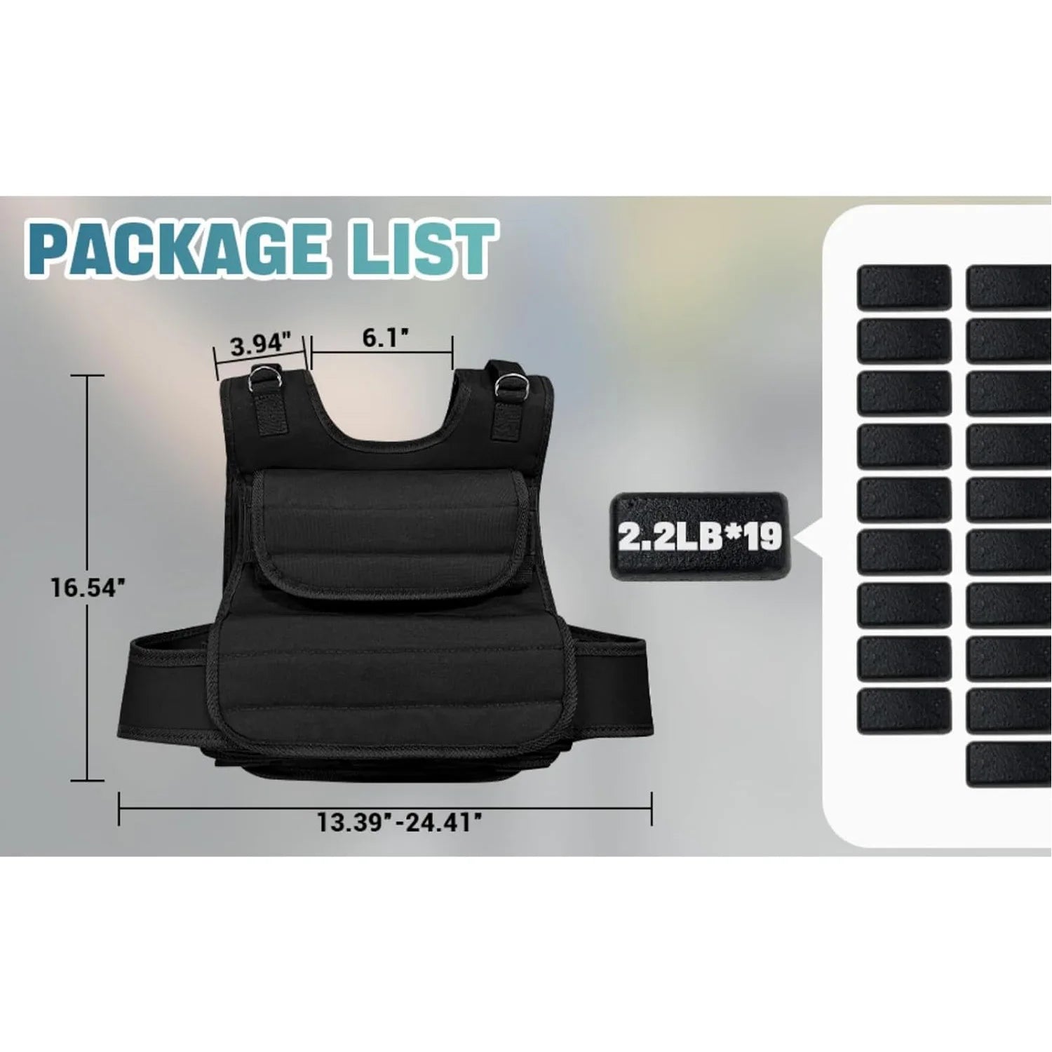 - Weight: Vest 2.3 lb; 19 iron weights at 2.2 lb each; maximum load ≈ 44 lb