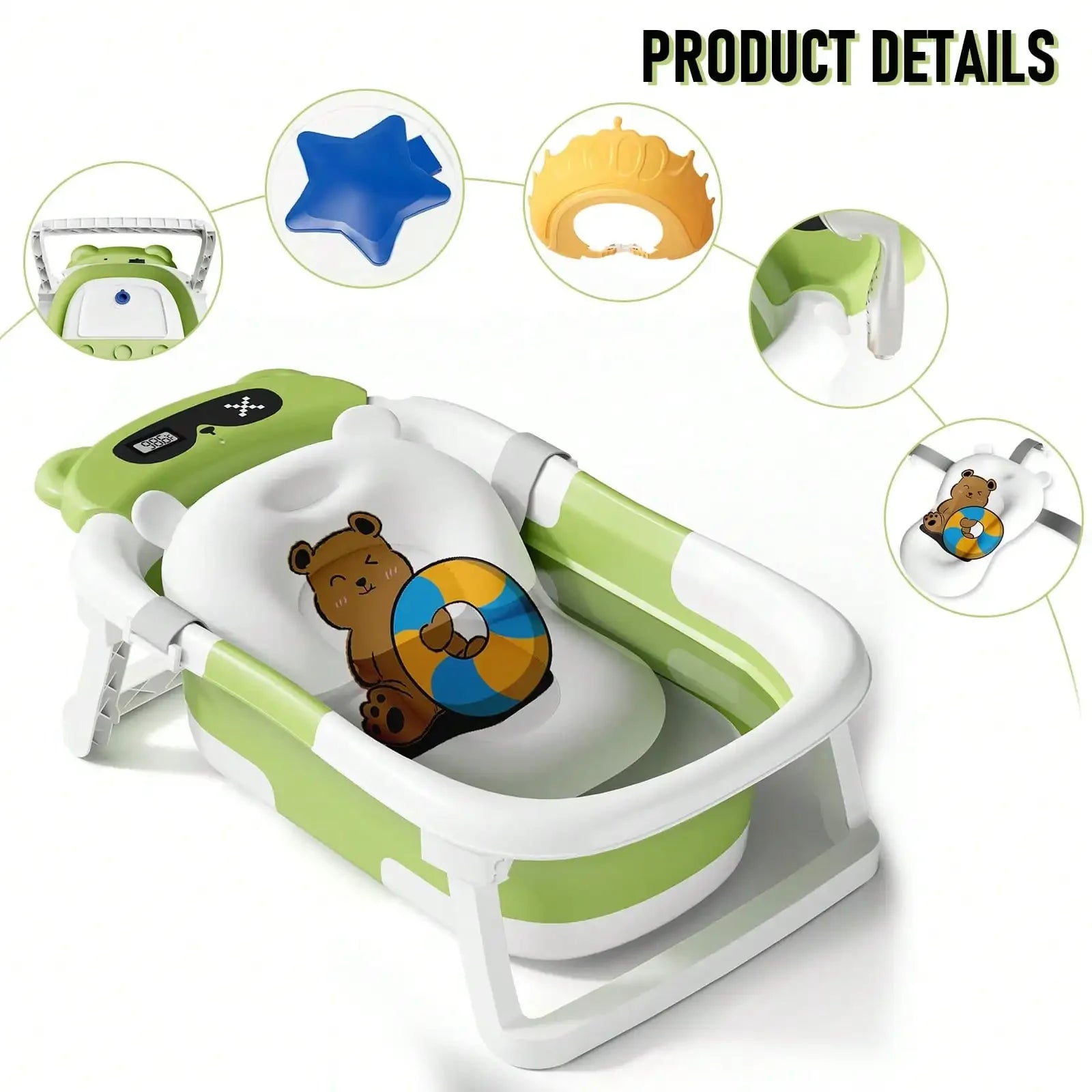 - Visible Temperature Sensor: Equipped with a precise temperature gauge, this bathtub allows parents to effortlessly monitor and adjust water temperature, ensuring your baby enjoys a safe and soothing bath.